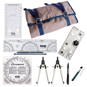 Everything you need to plot courses and fixes on paper. Parallel rules, course plotters, triangles, protractors, pencils, erasers, and templates—organized for classroom training and real-world cockpit work.