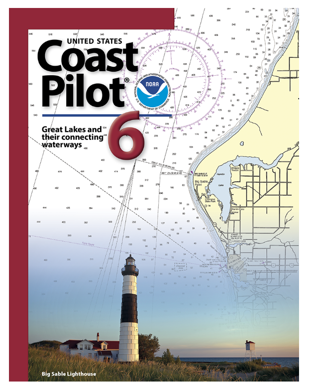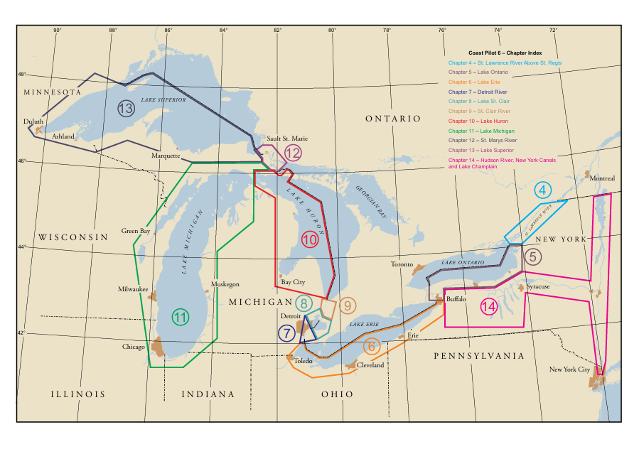 Coast Pilot 6 covers the Great Lakes system, including Lakes Ontario, Erie, Huron, Michigan, and Superior, their connecting waters, and the St. Lawrence River.